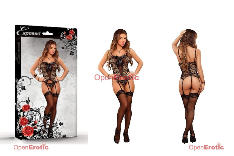 These sheer and sexy ensembles will make you the toast of the town... and the bubbly of the boudoir. Nude stretch satin with black stretch lace overlay is paired with black point d'esprit and black satin bows. This champagne will make you look sparkling.
